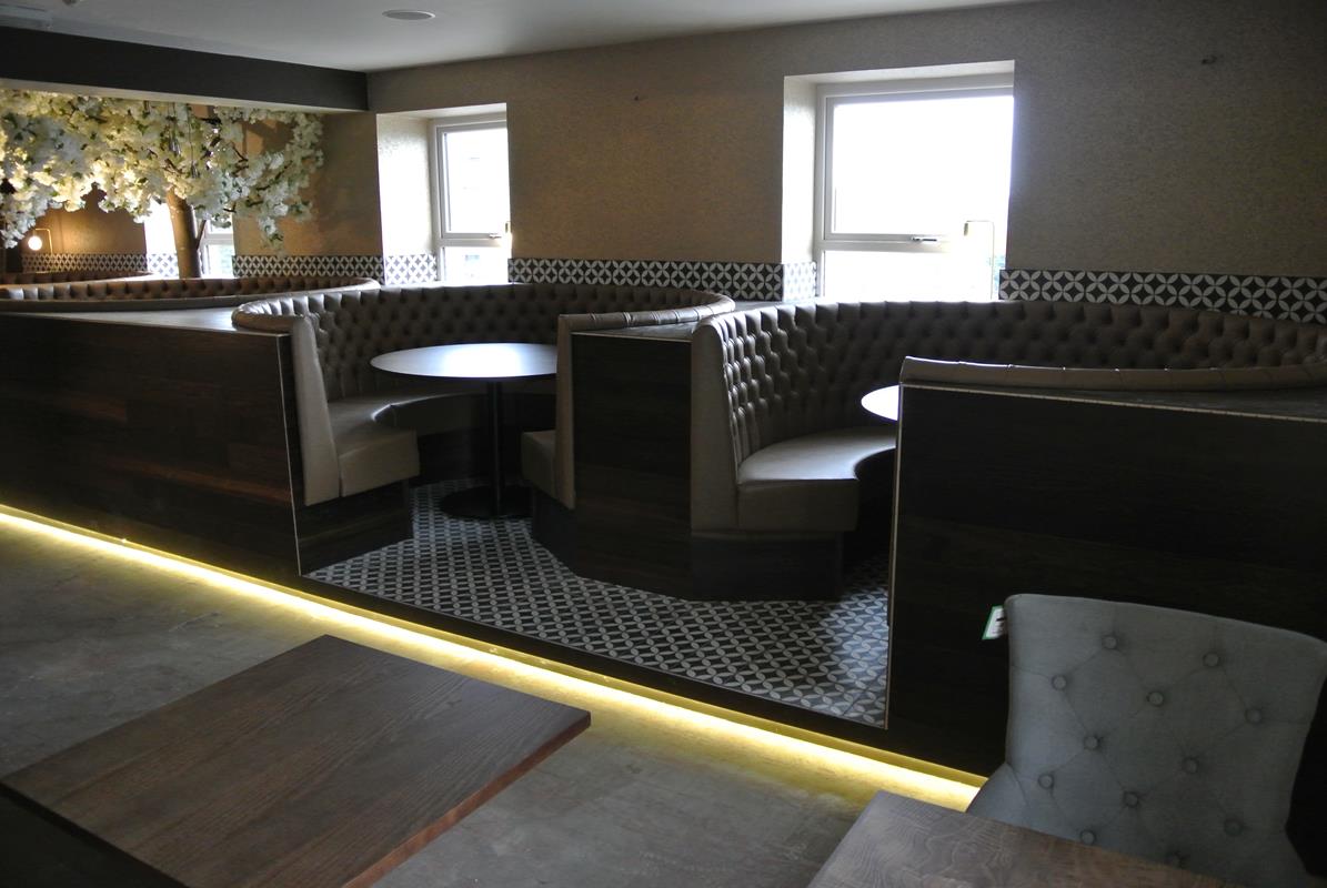 Browns Contract Furniture designed, manufactured, and installed a series of bespoke radius booths for The Plough Restaurant & Bar in Oswaldtwistle. The project transformed the dining space with curved, deep-buttoned seating upholstered in high-quality faux leather, paired with rich timber panelling to complement the venue’s sophisticated interior.